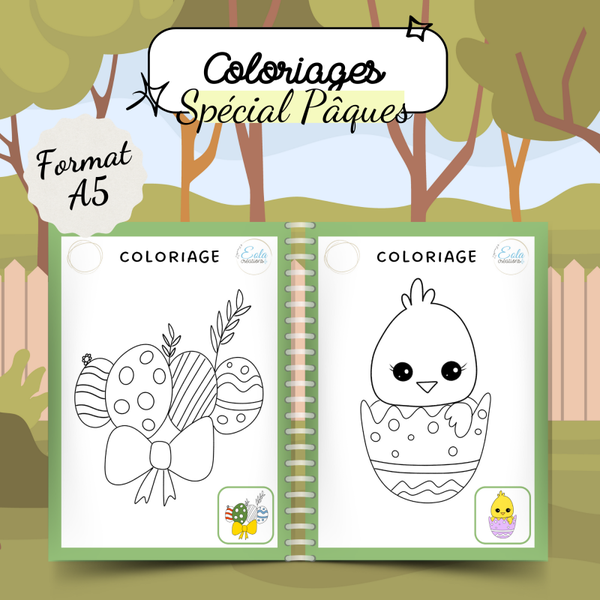 Grâce à ce cahier de coloriage, proposez à l'enfant un moment ludique pour colorier à l'infini avec de beaux dessins sur le thème de Pâques 🐣