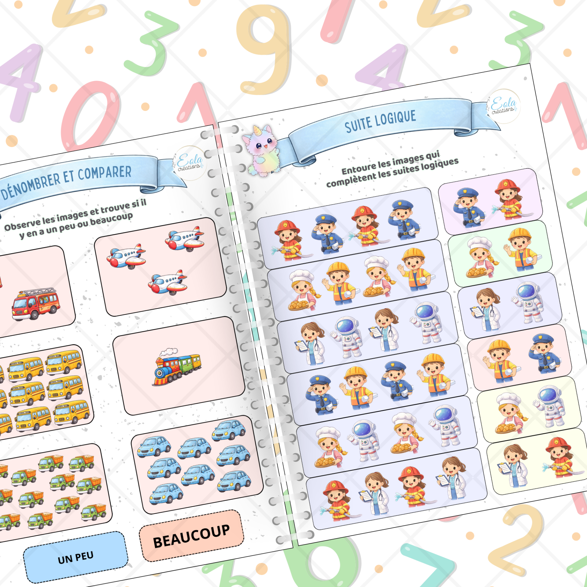 À travers des exercices ludiques, votre enfant apprendra à dénombrer, comparer les quantités, associer les chiffres aux quantités, repérer des suites logiques et s’entraîner à la pré-écriture. Le tout dans un univers doux et créatif, conçu pour apprendre en s’amusant !