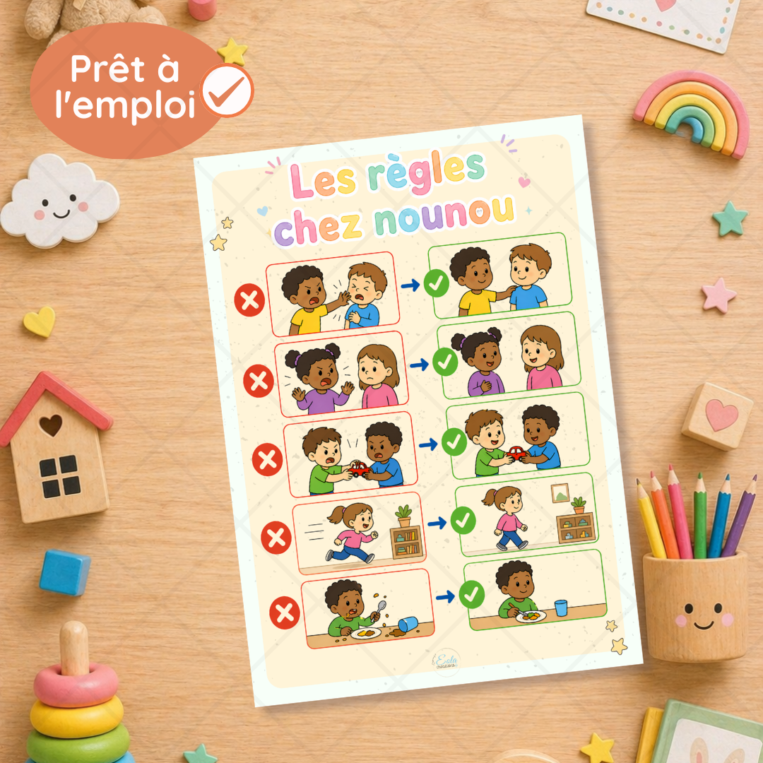 Cette affiche colorée présente les règles essentielles de la vie quotidienne chez nounou.